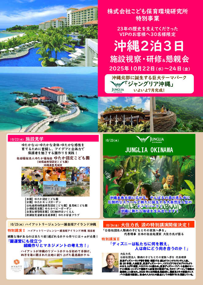 【10月開催】沖縄2泊3日 ※無事終了いたしました 2025.07.02一般募集研修会 HOME ブログ 一般募集研修会 【10月開催】沖縄2泊3日 ※無事終了いたしました 無事終了いたしました パンフレットダウンロードはこちら 氏名 メールアドレス メッセージ本文 Δ 投稿者: こども保育環境研究所 一般募集研修会 【9月開催】北海道2泊3日 ※無事終了いたしました 【10月開催】台湾2泊3日 ※無事終了いたしました 関連記事一覧 ✨🆕✨募集中!【1・3月実施】グローバル教育実践研修 2025.11.12一般募集研修会 🟢募集中!【12月開催】清里会議+施設視察 1泊2日 2025.10.07一般募集研修会 🔵満了 【11月開催】米国シアトル保育研修6日間 2025.07.02一般募集研修会 【10月開催】台湾2泊3日 ※無事終了いたしました 2025.07.02一般募集研修会